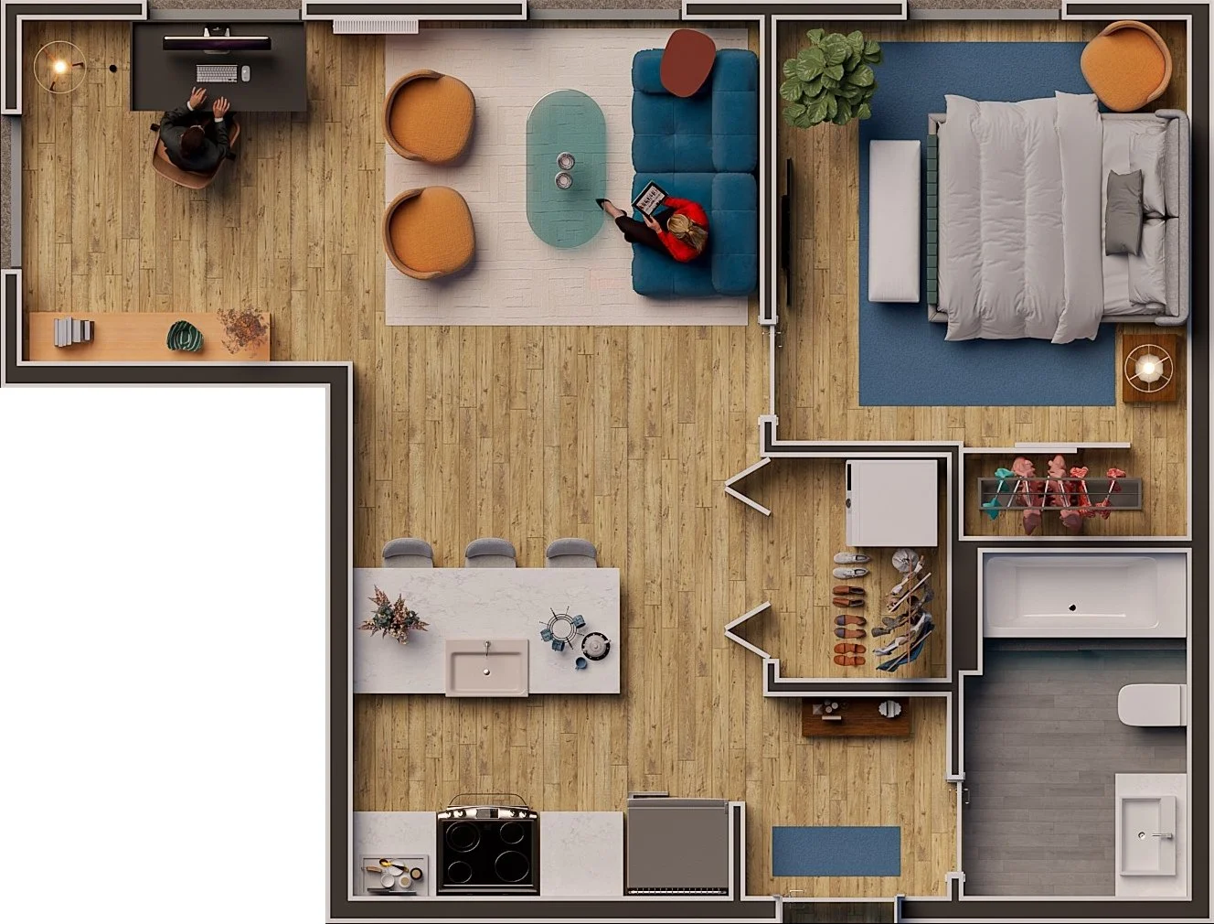 The single bedroom units maximize every inch of their 450 to 580 square-foot layouts to create a chic, modern urban retreat. Designed for those who value style and efficiency, the living area flows naturally into a sophisticated kitchen anchored by a solid-surface kitchen island. The single bedroom units face south and north, ensuring plenty of sunlight throughout the day.